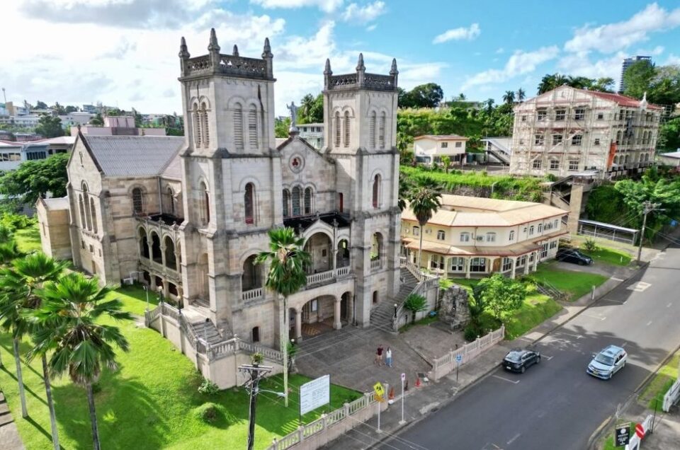 The Sacred Heart Cathedral or simply Cathedral of Suva, is the main ecclesiastical building of the Roman Catholic Church in the island nation of Fiji, and is located on Pratt Street in the City of Suva, Fiji’s capital. The Sacred Heart Cathedral is the headquarters of the Catholic Archdiocese of Suva. The construction of the Cathedral began in 1894 and was not completed until 1994, 150 years after the first Marist missionaries arrived in Fiji. The grand European design includes sandstone blocks imported from Australia, concrete staircases and balustrades, and two towers. The central stained glass window above the altar contains an image of a bilo cup beneath the Sacred Heart of Jesus.