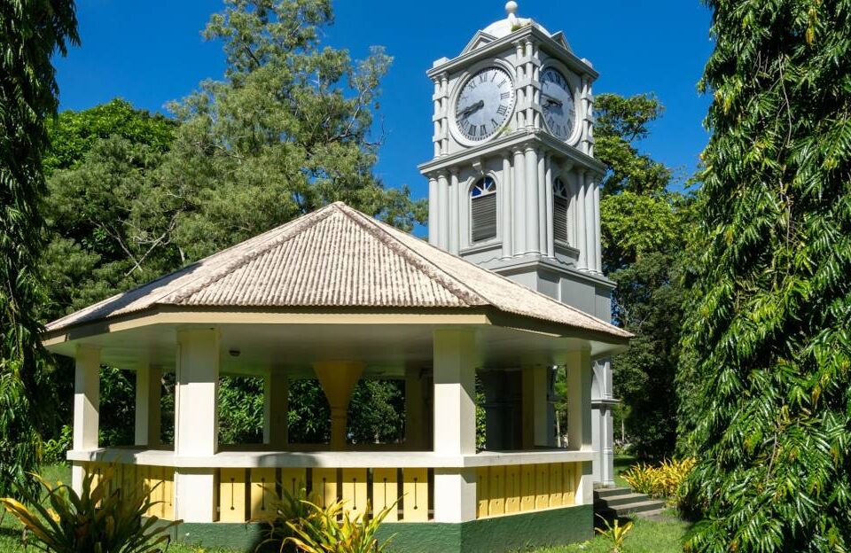 Thurston Gardens, formerly known as the Suva Botanical Gardens, is a botanical garden located in central Suva, between Albert Park and the Government House. The gardens were renamed in 1976 in honor of Sir John Bates Thurston, the fifth Governor of Fiji, who invited John Horne, a botanist, to establish a botanical garden in 1879. The gardens are built on the site of the original town of Suva, which was destroyed in a conflict in 1843. Thurston Gardens feature a variety of flora, including tropical trees, palms, ferns, colorful gingers, and water lilies. Notable structures within the gardens include the Clock Tower and bandstand, dedicated to the first mayor of Suva, and the Fiji Museum, which houses artifacts and exhibits detailing the history and culture of Fiji.
