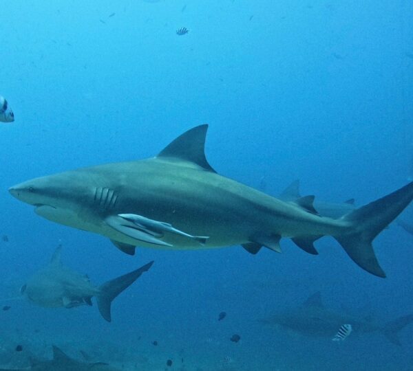 This dive features up to eight different species of shark: bull shark (largest in the world), whitetip reef shark, blacktip reef shark, nurse shark, lemon shark, grey reef shark, silvertip shark, and even the elusive tiger shark. This dive offers the chance to see over 300 species of fish. As divers descend through the clear waters to a landing at 18m/60 ft, they will see sharks circling below them along with hundreds of jacks, snappers and other fish species swirling around the feeding area. Some divers are rewarded with rare sightings of the huge queensland grouper and humphead wrasse. Divers are not in a cage, but situated on the reef around the perimeter of the dive site called "The Bistro." Once settled in, the feed begins. Tawny nurse sharks are abundant and not shy as they crowd around. Lemon Sharks attend in ones or twos. Silver tips dart in and out from the blue. The main attraction, the huge Bull Sharks, arrive in numbers as far as the eye can see. They purposefully move in, opening their enormous jaws to take food in direct view of the diving guests. After 20 minutes of bottom time, divers ascend up the beautiful reef ledge where grey reef, black tip and white tip reef sharks swim freely. After diving among the big boys (and girls), this part of the dive seems like the nursery.
