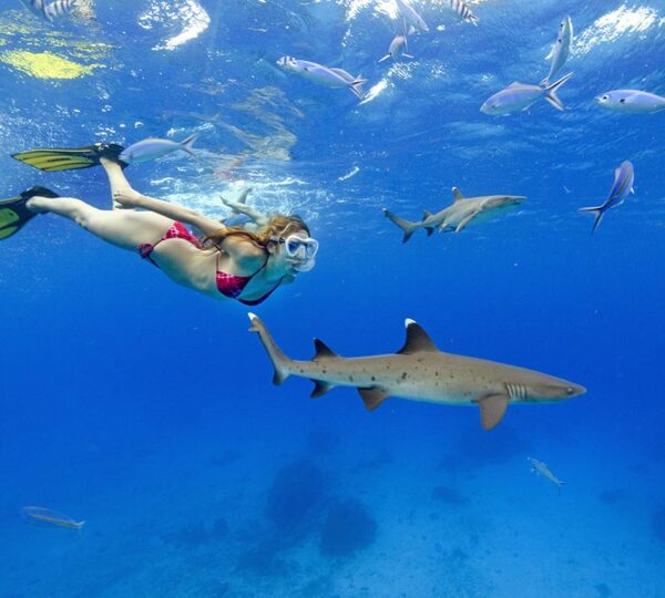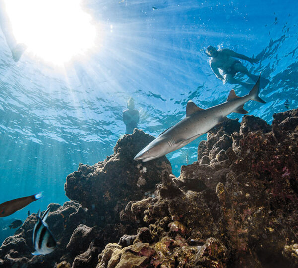 There are two main species of sharks encountered, White Tip Reef Sharks and Black Tip Reef Sharks, both are common in the tropical warm waters of the South Pacific. They can grow to a length of up to 1.8 metres although they appear 25% larger under the water due to a snorkelling face mask’s optical illusion. Whitetips are the dominant species and are curious sharks not frightened to check you out while Blacktips are by contrast timid and will shy away if they feel threatened.